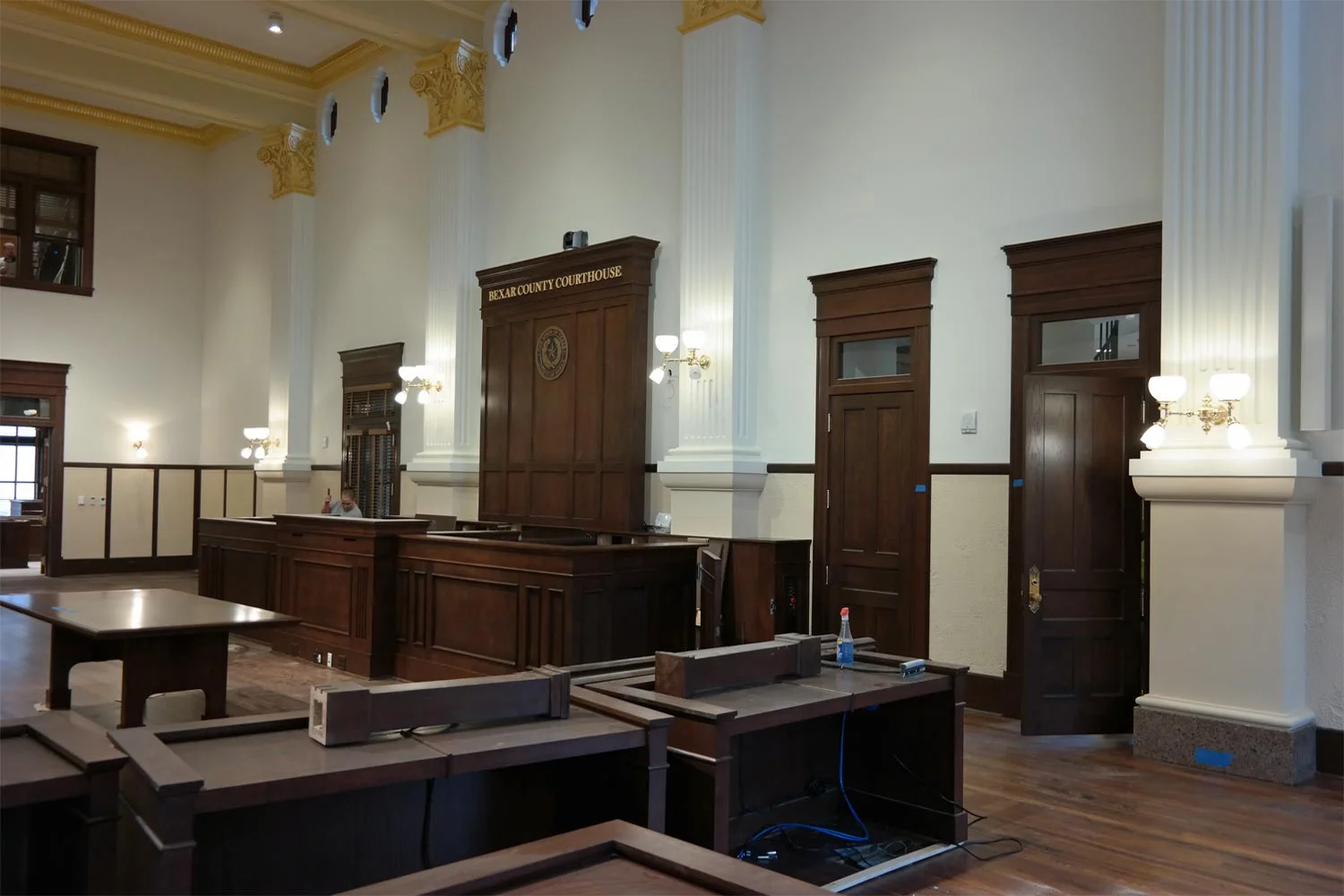 Happy New Year everyone! We are excited for what lies ahead in 2015 for Fisher Heck and we look forward to sharing more of what we are working on throughout the year. In about a month, we will be wrapping up the 1896 Double-Height Courtroom Project in the Bexar County Courthouse. It's been over 5 years in the making and we are thrilled that it's almost complete! Lewis, Jim and David were on site this morning and snapped a few shots of the progress. Have a great weekend and a great new year everyone!
